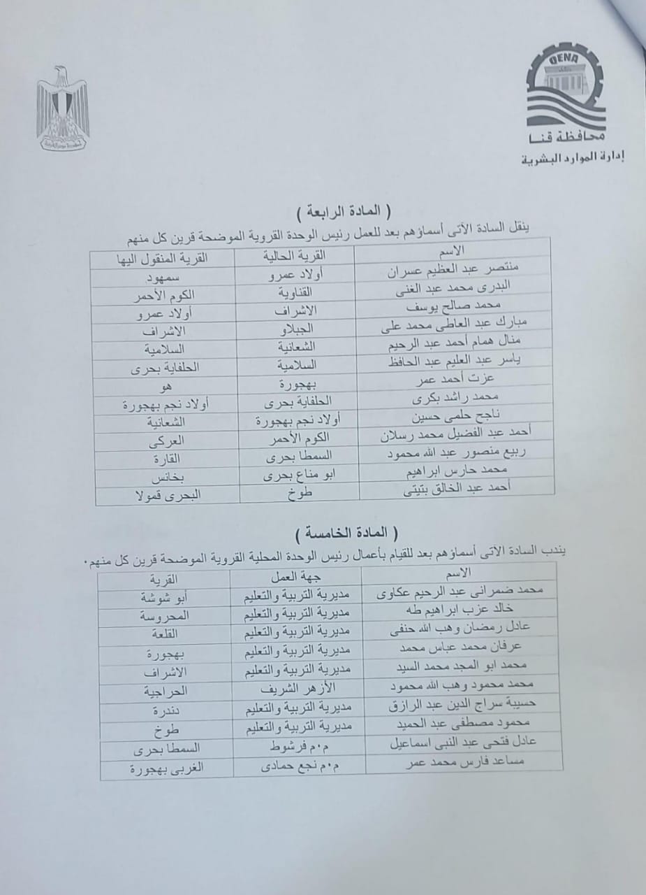 تضمن القرار أيضًا نقل عدد من رؤساء القرى من مناطق إلى أخرى، ومن بينهم منتصر عبد العظيم من أولاد عمرو لقرية سمهود، والبدري محمد عبد الغني من القناوية لقرية الكوم الأحمر، ومحمد صالح يوسف من الإشراف لقرية أولاد عمرو، وغيرها من التنقلات بين مختلف القرى في محافظة قنا.