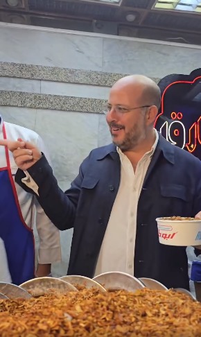 ظهر الأمير محمد علي حفيد الملك فاروق، خلال مقطع فيديو قصير نشرته الصفحة الرسمية لكشري أبو طارق، رفقة نجليه فؤاد وفرح، وهو يعد علبة كشري داخل المطبخ، وسط العاملين بالمطعم.