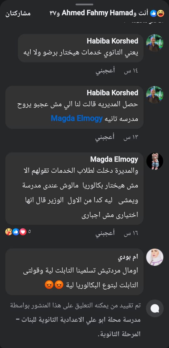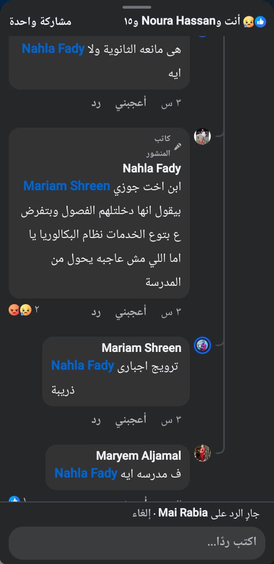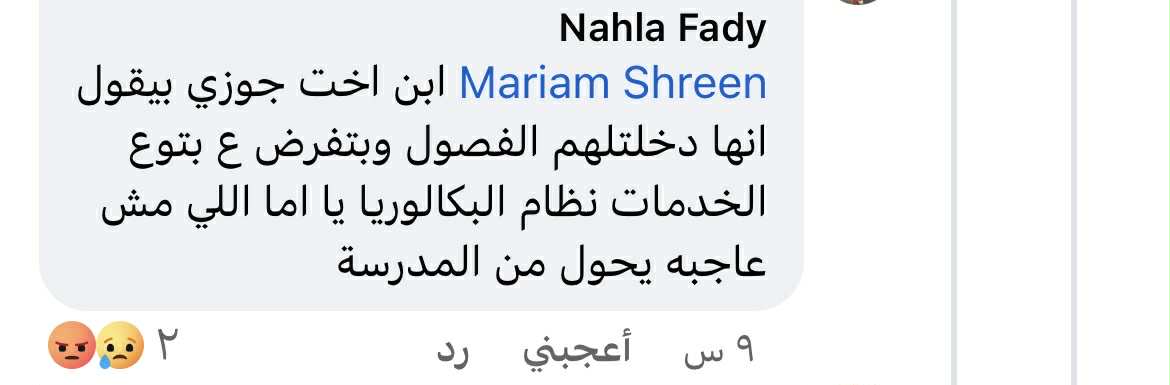 من جانبها قالت ولية أمر طالبة مدرسة محلة أبو علي، إن ابنتها وزملاءها في الصف الأول الثانوي في شكوى مستمرة منذ أسبوع من إجبار مديرة المدرسة إلى جانب مدرس آخر غير معروف لهم، على اختيار نظام "البكالوريا"، مهددين برسوبهم أو النقل إلى مدرسة أخرى.