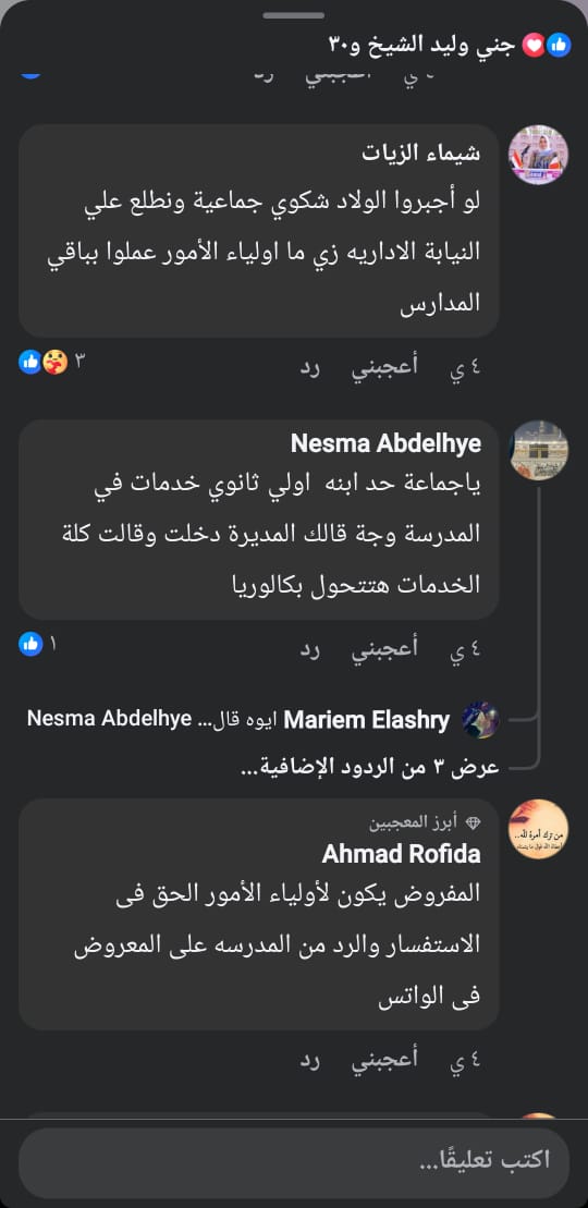 ولفتت ولية الأمر إلى أن هناك شكاوى أخرى من أولياء الأمور، بشأن إجبار بناتهن على اختيار النظام، فطالبت منهن تقديم شكوى جماعية، وفيما يلي يُمكن الاطلاع على بعض التعليقات الخاصة بأولياء الأمور: