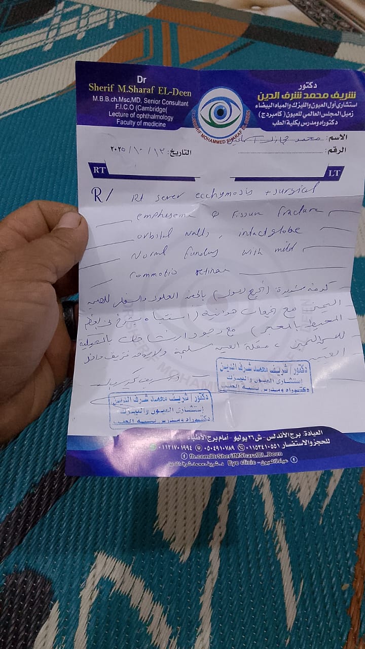 تسببت هذه الخشبة في كدمة شديدة (تجمع دموي) بالجفن العلوي والسفلي للعين، مع اشتباه بشرخ في العظم المحيط بالمحجر، وارتشاحات بالشبكية للعين اليمنى، وحوله الطبيب إلى مستشفى جامعة الزقازيق، لعمل الأشعة اللازمة وتلقي العلاج، وطلب الأطباء إجراء عملية، وتم تحرير محضر بالواقعة، وحُجز المتهم ليومين ثم خرج على ذمة القضية.