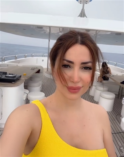 وظهرت نسرين خلال بعض الصور وهي مرتدية مايوه باللون الأصفر تستعد للنزول بالبحر، وعلى سلم المركب، وأخرى خلال استماعها بالشمس.