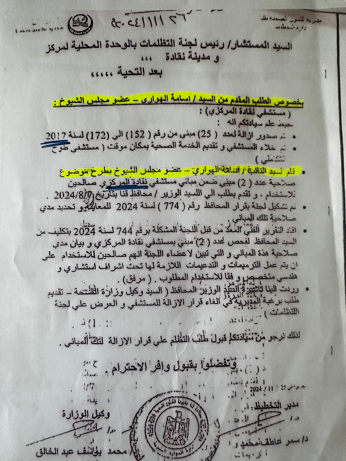 وتقدم النائب بطلب لمحافظ قنا الدكتور خالد عبد الحليم، بتشكيل لجنة هندسية محايدة لإنقاذ المستشفى وإيقاف قرارات الإزالة، والتي كشفت أن المباني صالحة أعقبها تظلم قدم من وزارة الصحة بناء على طلب النائب ليتم استبدال القرار من الإزالة لرفع كفاءتها لصلاحيتها وهو ما وفر مئات الملايين للدولة كانت ستتكبدها حال تنفيذ الإزالة وعودة الخدمة للأهالي بعد 8 سنوات من إخلاء المستشفى.