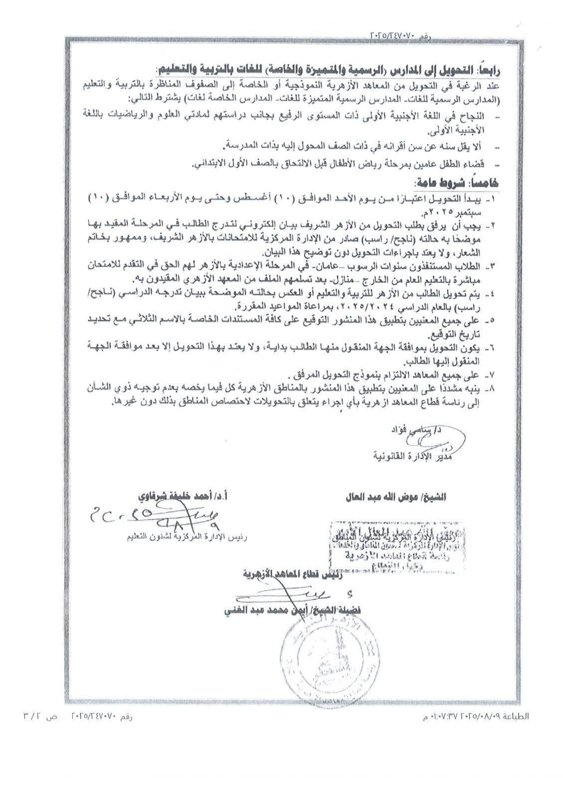 - يتم تحويل الطالب من الأزهر للتربية والتعليم أو العكس بحالة الطالب الموضحة ببيان تدرجه الدراسي “ناجح أو راسب”، وذلك بالعام الدراسي 2024-2025، مع مراعاة المواعيد المقررة.