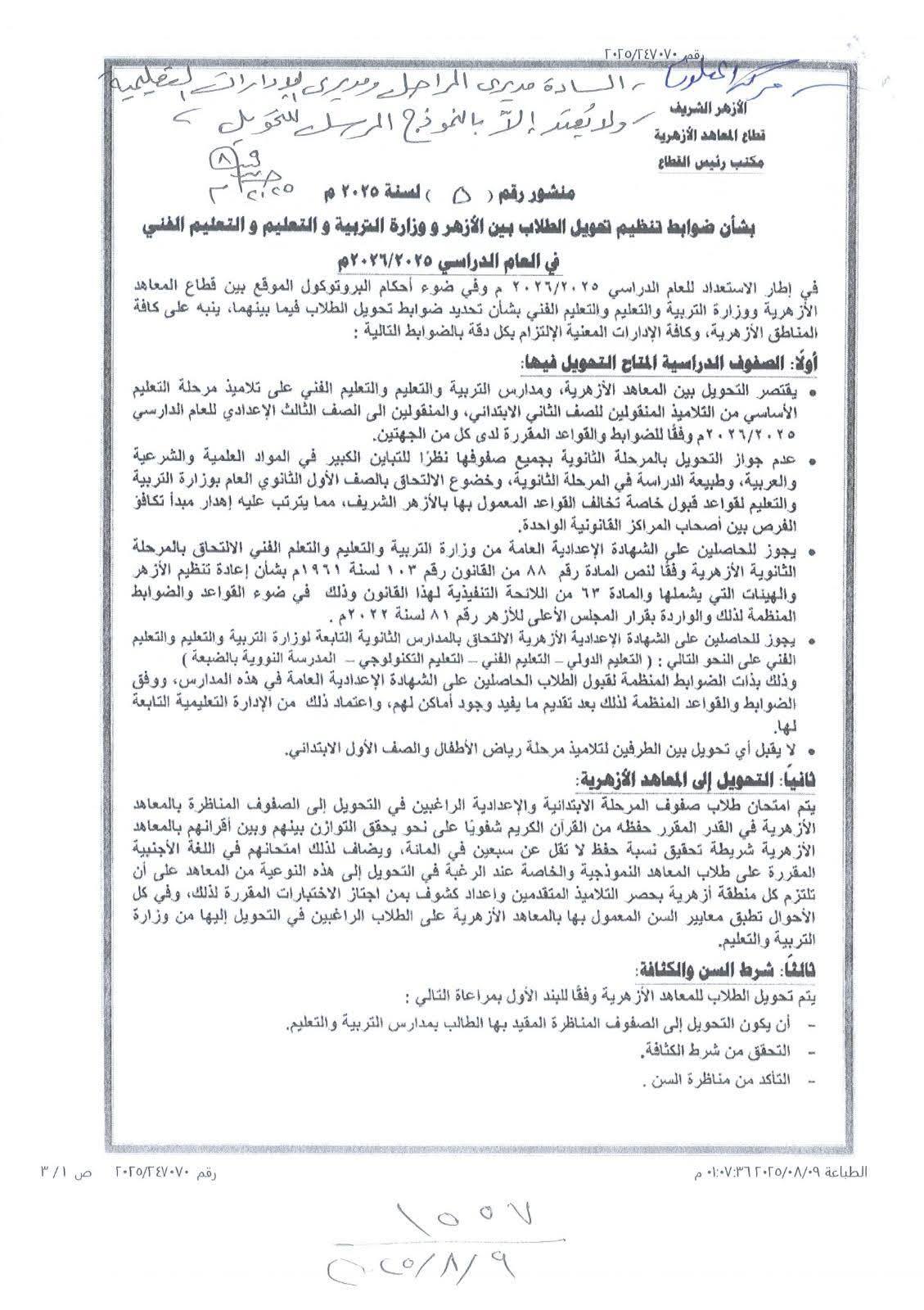 ضوابط التحويل بين الأزهر والتربية والتعليم 2025