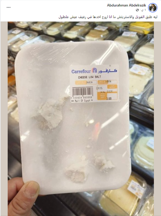 الشاب "عبدالرحمن عبدالرازق" صاحب الصورة المنتشرة على “فيسبوك” أرفق تعليقًا ساخرًا، قال فيه: "ليه طبق الفويل والاستريتش ما أنا أروح أخذها في رغيف عيش علطول".