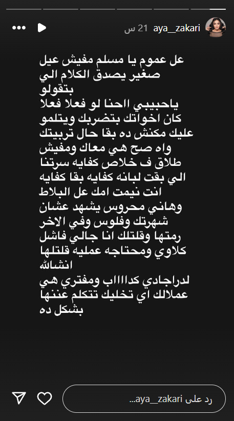 وبعد ساعات من انتهاء مسلم للبث المباشر، خرجت شقيقته للرد على حديثه عنهم وعن أيام طفولته القاسية، عبر حسابها الرسمي على منصة “إنستجرام” قائلة: “على العموم يا مسلم مفيش عيل صغير يصدق الكلام اللي بتقوله ده”.