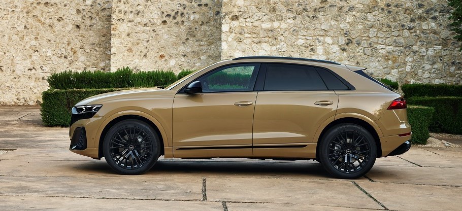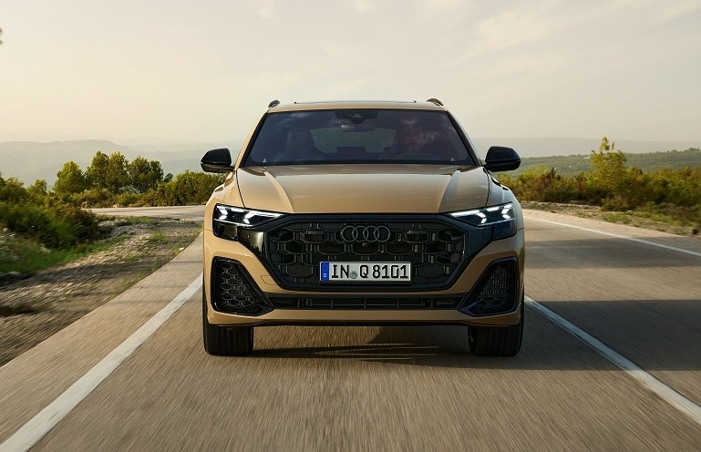 جهزت أودي Q8 الفيس ليفت الجديدة بخيارات الإضاءة المتطورة، وما زالت الواجهة الأمامية تستعين بشبك التهوية كبير الحجم، ولكن بفضل مكوّناتها الداخلية ذات الأضلاع الثمانية، واللمسات رمادية اللون (Scandium Gray) التي تأتي ضمن باقة S-Line الرياضية؛ باتت السيارة تتمتَّع بتصميم رياضي أكثر جرأة عن أي وقت مضى.