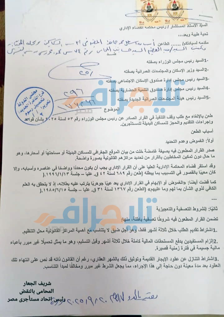 قدم عضو اتحاد المستأجرين، أسامة اسماعيل، نيابة عن رئيس الاتحاد شريف الجعار، طعنا بإلغاء وطلب وقف تنفيذ القرار الصادر عن رئيس مجلس الوزراء رقم 53 لسنة 2025، والمتعلق بقواعد وإجراءات التقديم والحجز للمساكن البديلة للمستأجرين.