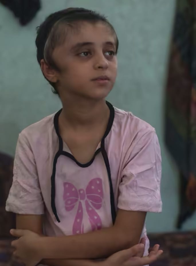 الحرب قادرة على تغيير أي شيئ حتى الاطفال لم يسلموا منها، فهذه الطفلة الجميلة لم تعد كما كانت من قبل، تلهو كأي طفلة في عمرها، بشعرها الأسود الطويل وضحكتها الطفولية، إلى أن اخترقت شظية رأسها الصغير فكسرت جمجمتها، وسلبت طفولتها، ومنذ ذلك اليوم، وهي تعيش رحلة صعبة بين الألم والخوف، في انتظار عملية عاجلة قد تنقذ حياتها أو تحكم عليها بالموت.