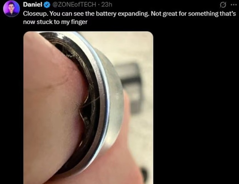 وكتب صانع المحتوى دانيال روتار عبر منصة "إكس" وهو يمر بأزمته: "بطارية خاتم سامسونج جالاكسي الخاص بي بدأت في التضخم، وهو ما زال في إصبعي، وفي نفس اللحظة أنا الآن على وشك ركوب الطائرة ولا أستطيع خلعه.. هل من اقتراحات سريعة؟".