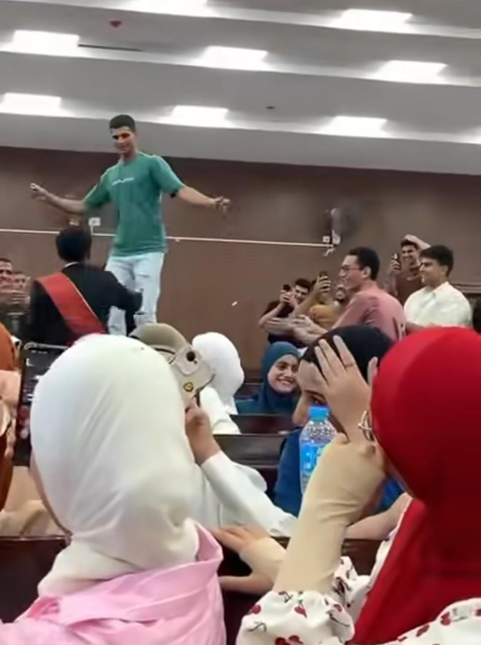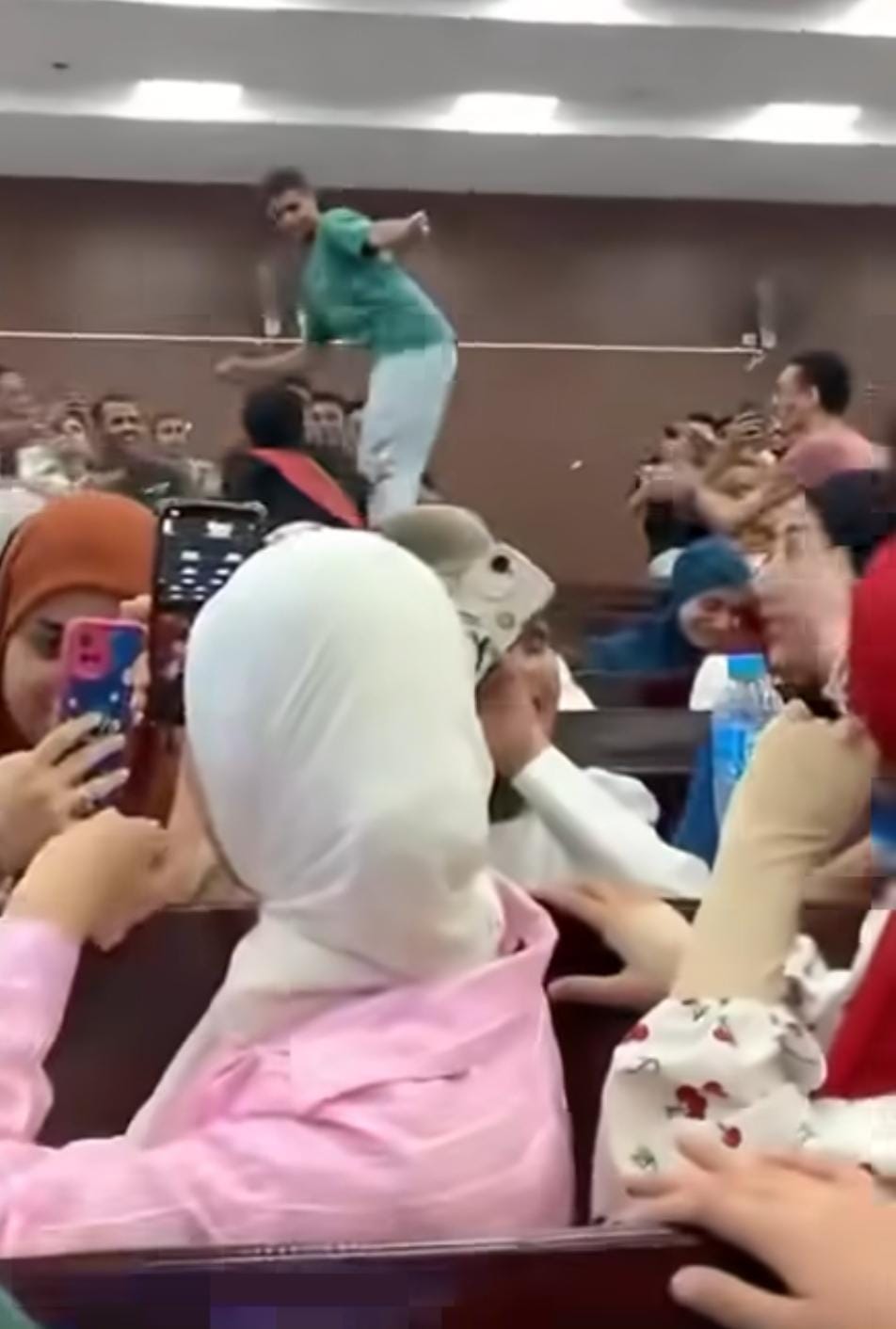 وظهر الطالب في المقطع المتداول، وهو يصعد أعلى المدرج، وبدأ في وصلة رقص شرقي وسط زملائه، الذين اهتموا برفع هواتفهم وتصويره لتوثيق الحدث، وهو ما سبب غضبًا لدى نشطاء السوشيال ميديا.