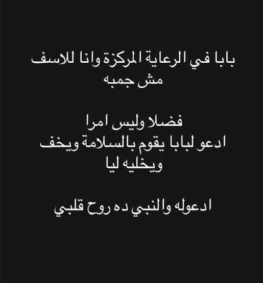 وكتبت بتول الحداد عبر حسابها بمنصة “إنستجرام”، منشورًا، قالت فيه: “بابا في العناية المركزة وأنا للأسف مش جنبه، فضلًا ادعوا له يقوم بالسلامة ويخف ويخليه ليا، ادعوا له والنبي دا روح قلبي”.