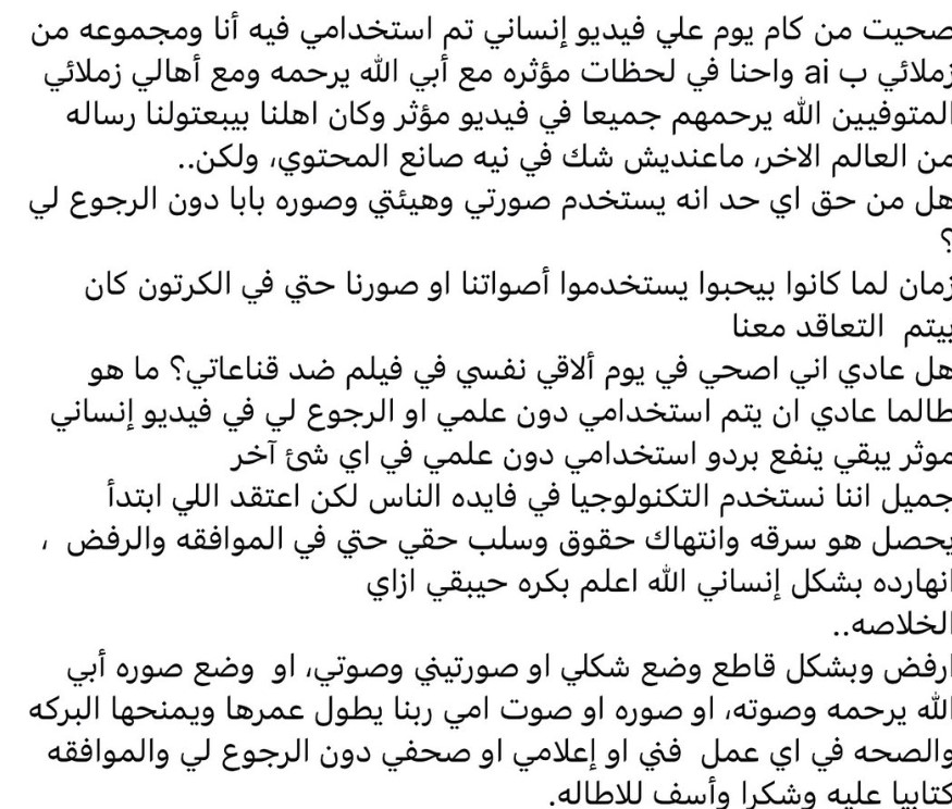 وأضافت: "معنديش شك في نية صانع المحتوى، لكن هل من حق أي حد إنه يستخدم صورتي وهيئتي وصورة بابا دون الرجوع لي؟، زمان لما كانوا بيحبوا يستخدموا أصواتنا أو صورنا حتى في الكارتون كان بيتم التعاقد معانا، هل عادي أصحى في يوم ألاقي نفسي في فيلم ضد قناعاتي، ما هو طالما عادي أن يتم استخدامي دون علمي ينفع برضه استخدامي في أي شيء آخر!".