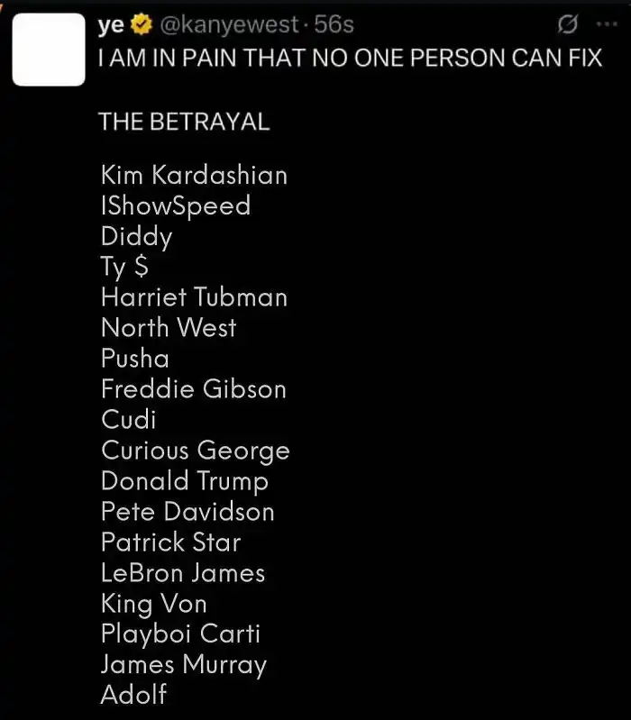 نشر كانييه ويست منشورا عبر منصة “إكس” - إذ يحظى بأكثر من 33 مليون متابع - يحتوي على قائمة أسماء وصفها بـ"الخائنة" معلقا: “أشعر بألم لا يمكن إصلاحه، الخيانة”.
