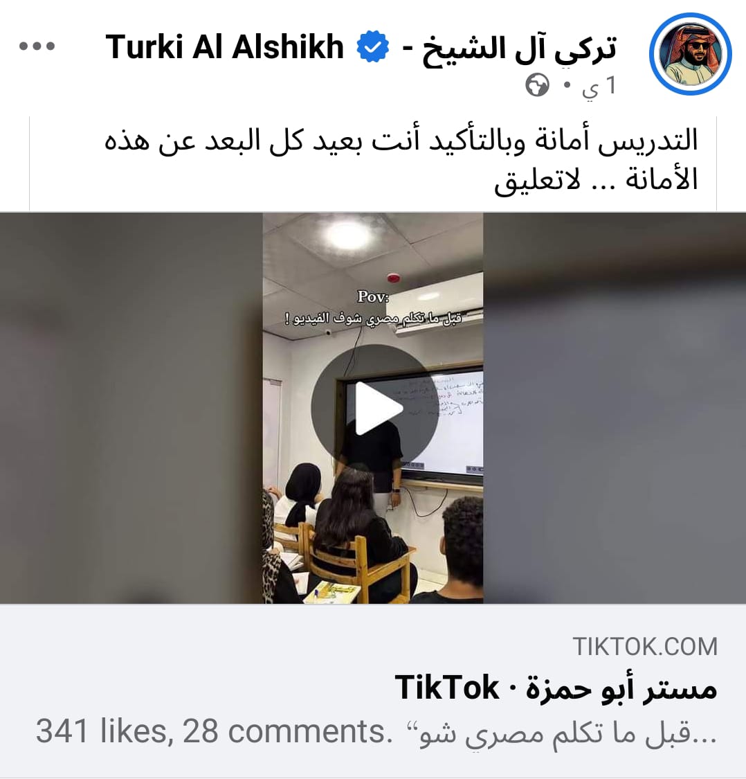 من جانبه علق تركي آل الشيخ على مقطع “الفيديو”، الذي نشره مدرس اللغة العربية، قائلًا: “التدريس أمانة وبالتأكيد أنت بعيد كل البعد عن هذه الأمانة.. لا تعليق”.