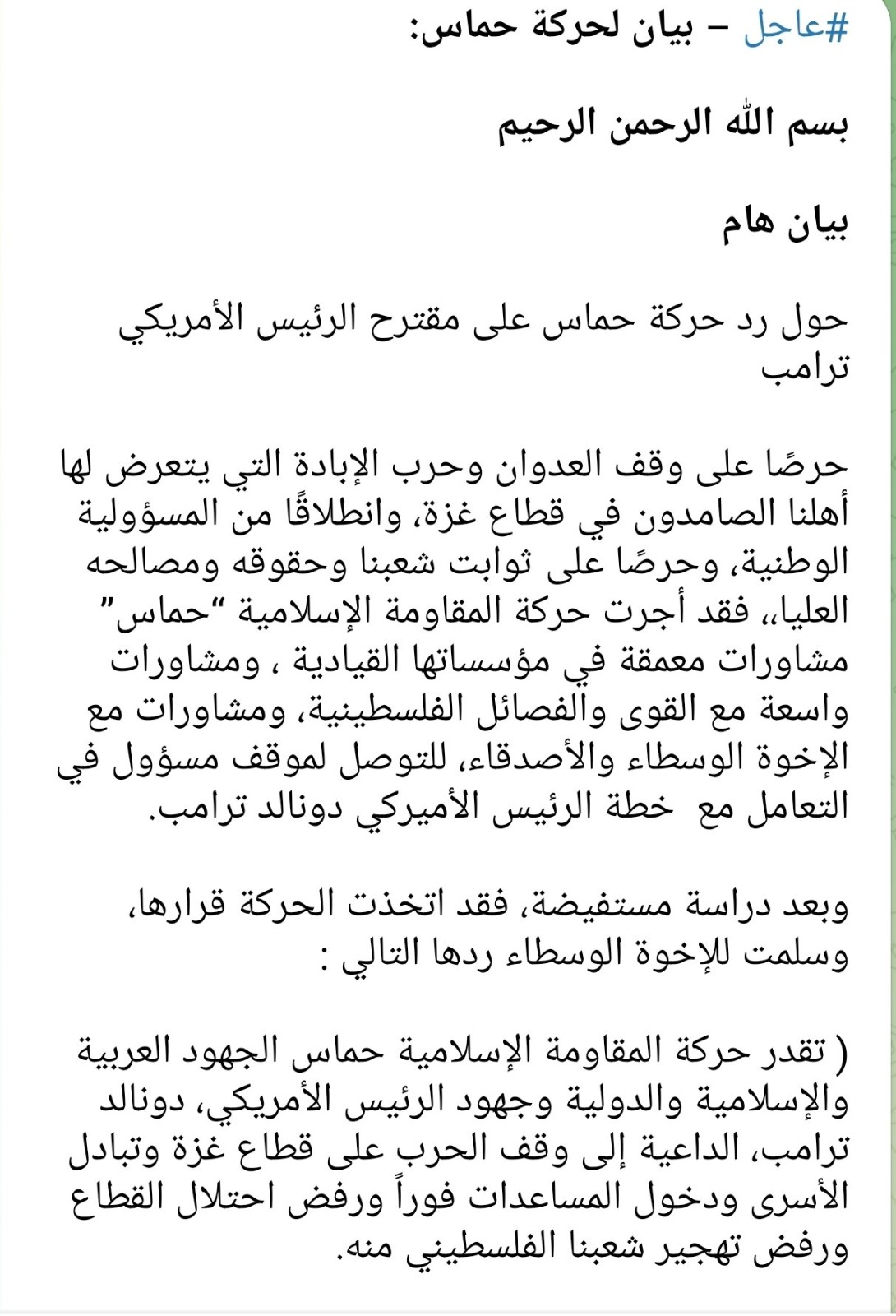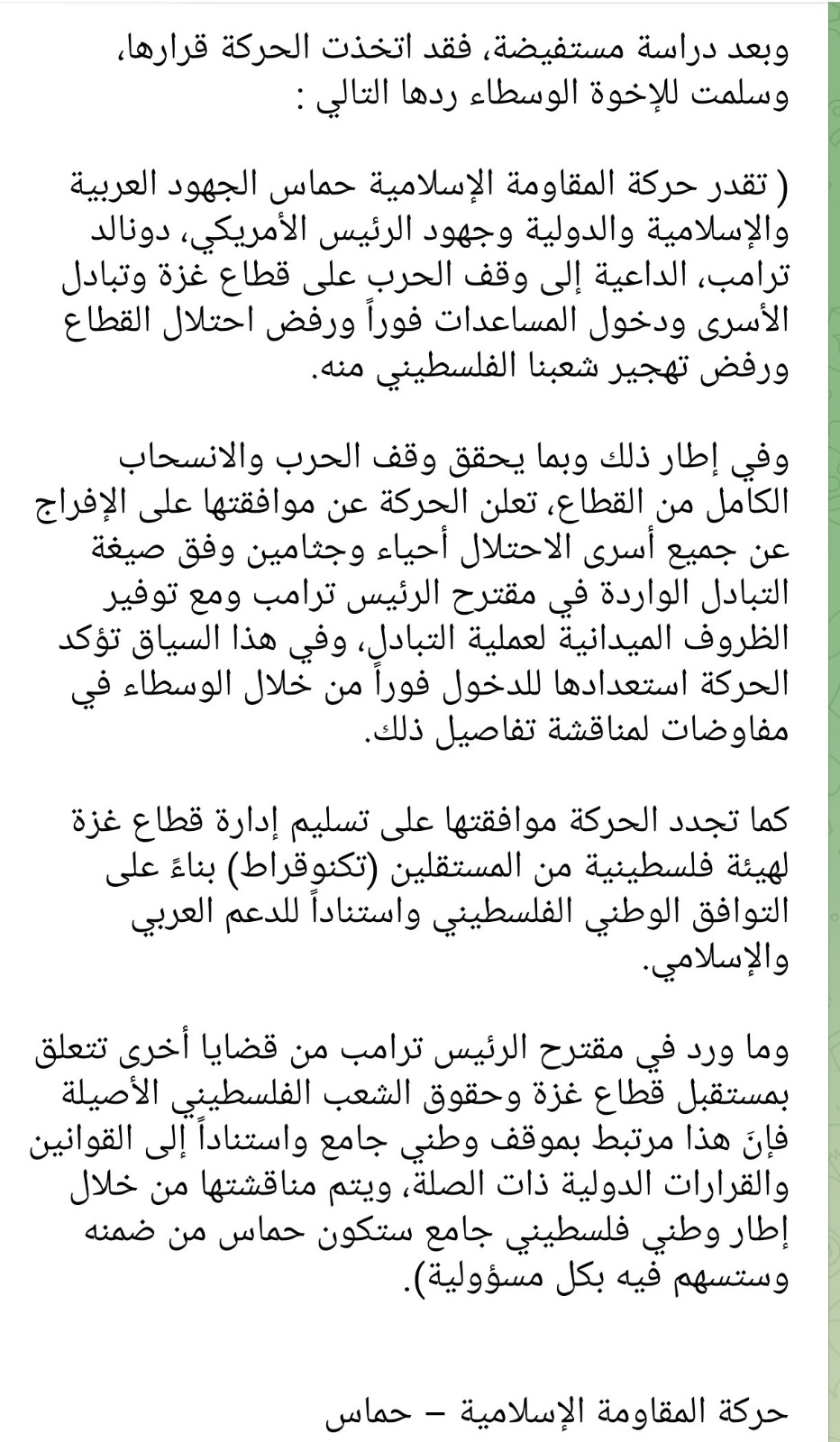 وبالرجوع إلى بيان حماس، الذي أصدرته أمس، فقد أشارت أنها موافقة على الإفراج عن جميع أسرى الاحتلال أحياءً وجثامين، وفق صيغة التبادل الواردة في المقترح الأمريكي، مع توفير الظروف الميدانية المناسبة لعملية التبادل، مؤكدة استعدادها للدخول فورًا في مفاوضات عبر الوسطاء لمناقشة تفاصيل الاتفاق.