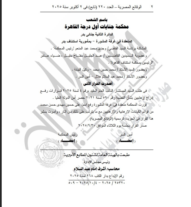 نشرت الجريدة الرسمية قرار المحكمة المنعقدة في غرفة المشورة، القاضي برفع اسم “علي حسين مهدي حسن محمد” من قوائم الكيانات الإرهابية والإرهابيين، مع ما يترتب على ذلك من آثار قانونية.