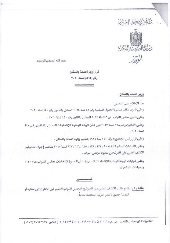 أكد القرار تطبيق الإجراءات الواردة بقرار وزير الصحة رقم ٥٩٢ لسنة ٢٠٢٠ بالنسبة للمصريين المقيمين بالخارج، حيث يتم الكشف الطبي من خلال السفارات أو القنصليات المصرية، بالتنسيق مع المستشفيات المعتمدة لديها، وبذات الضوابط والإجراءات.