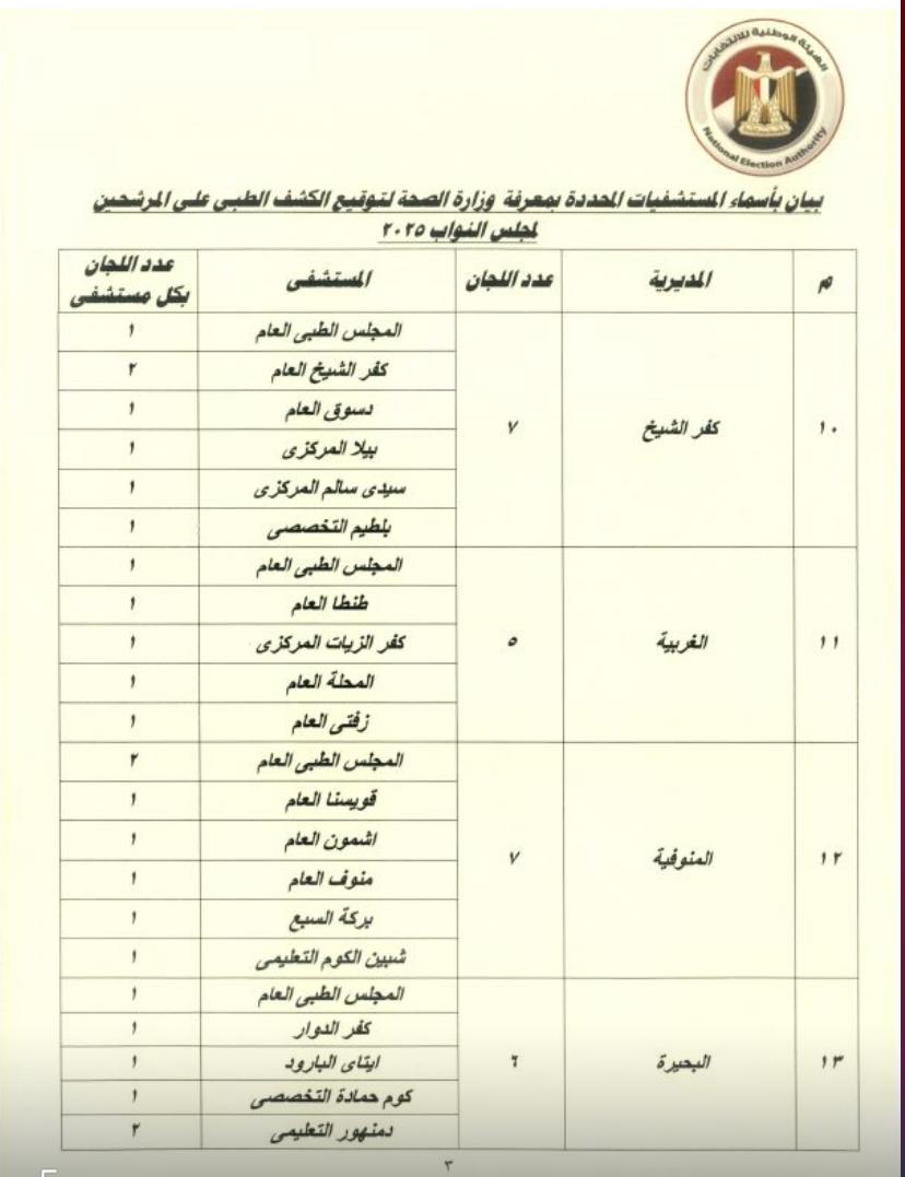 وأشار القرار إلى أنه يجوز تشكيل لجنة أو أكثر لإجراء الفحوصات في المستشفيات المحددة بالكشوف المرفقة، على أن تعمل تحت إشراف المجلس الطبي العام بالمحافظة.