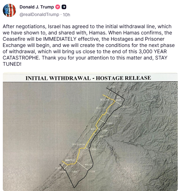 ونشر ترامب مع منشوره رسمًا بيانيًا يوضح مسار الانسحاب المقترح من غزة، والذي وصف بأنه الخطوة الأولى ضمن خطته للسلام التي أعلن عنها الأسبوع الماضي.