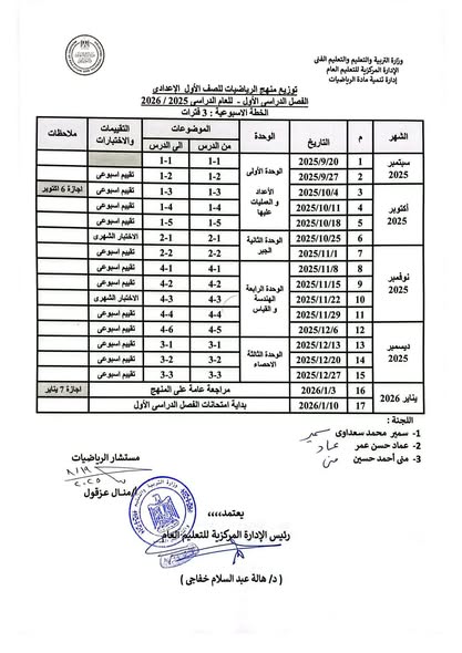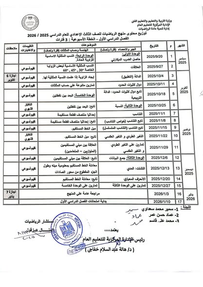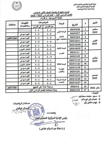 توزيع منهج الرياضيات 2026 للمرحلة الاعدادية