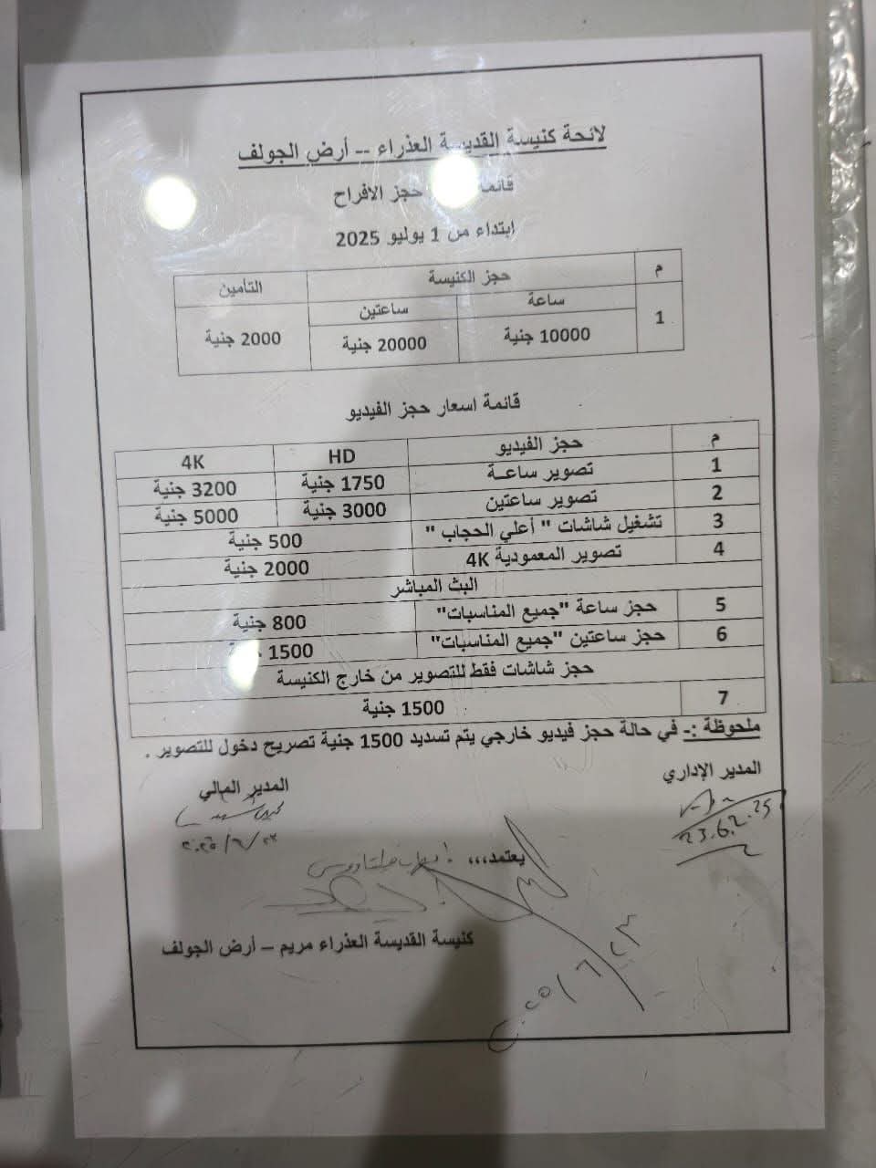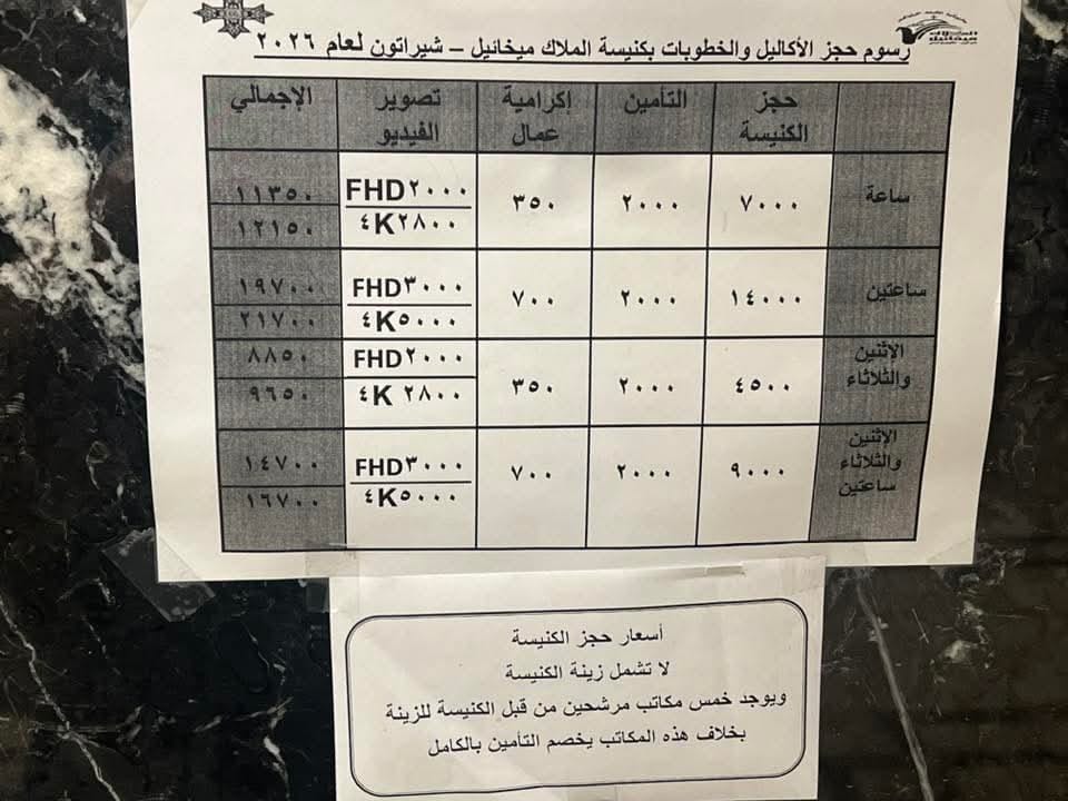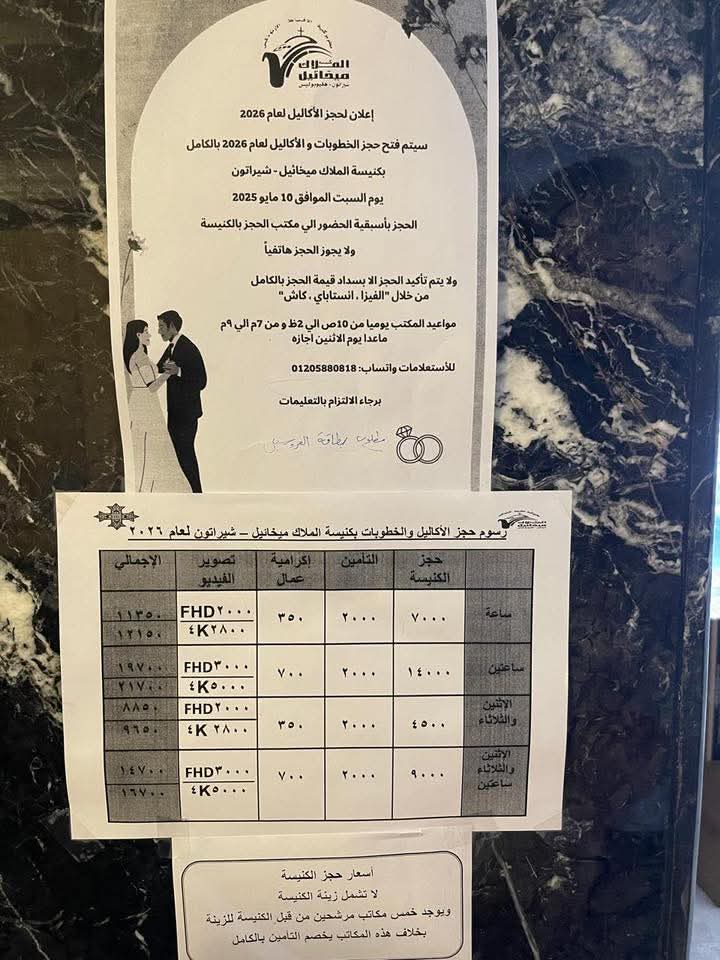 وأضافت أن سعر الساعة الواحدة داخل الكنيسة يبلغ 7000 جنيه، بينما تمتد الحجوزات عادة لساعتين بقيمة تصل إلى 14 ألف جنيه، وقد ترتفع التكلفة بعد إضافة التصوير والزينة لتصل إلى 21 ألف جنيه.