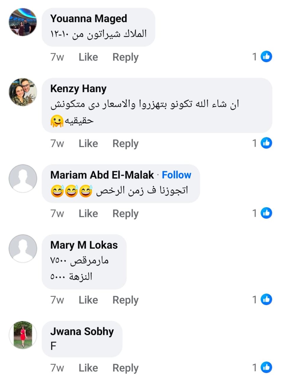بينما كتبت مريم غطاس في تعليق ساخر آخر: "هي الأسعار دي حقيقية؟ لو كده نروح نكلل عند إخواتنا المسلمين، أرخص وأهدى".