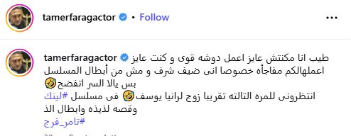 وعلّق تامر فرج على البوستر قائلًا: "طيب أنا مكنتش عايز أعمل دوشة قوي، وكنت عايز أعملها لكم مفاجأة، خصوصًا إني ضيف شرف ومش من أبطال المسلسل، بس يالا السر اتفضح… انتظروني للمرة التالتة تقريبًا زوج لرانيا يوسف، في مسلسل لينك، وقصة لذيذة وأبطال ألذ".