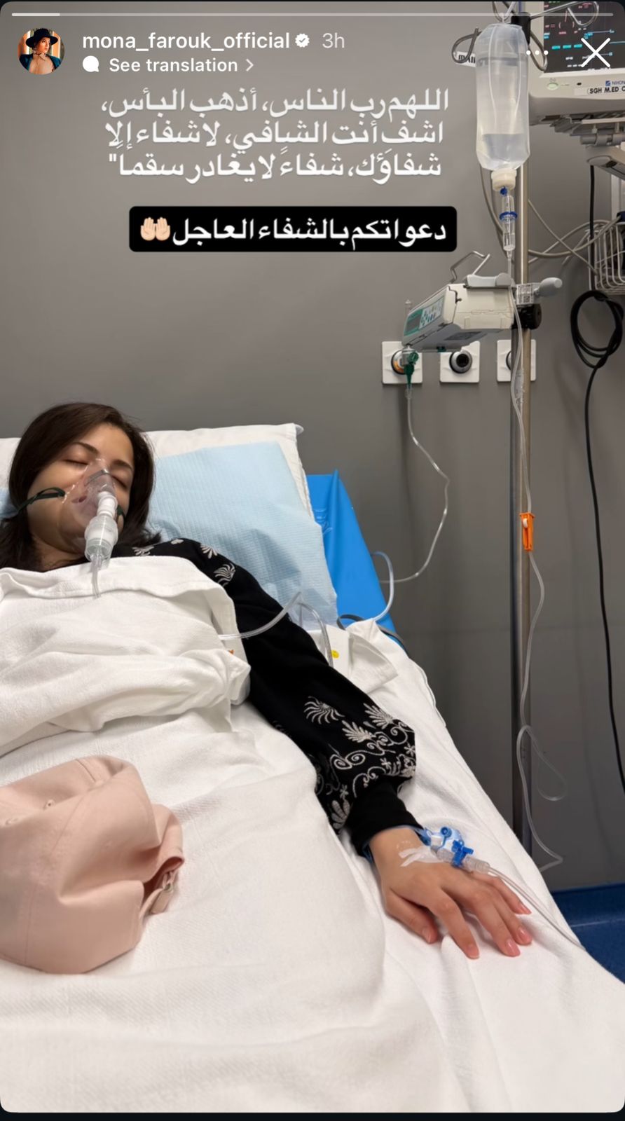 وشاركت منى فاروق متابعيها صورة لها من داخل المستشفى عبر حسابها على منصة “إنستجرام”، وأرفقت مع الصورة دعاءً: “اللهم رب الناس، أذهب البأس، اشف أنت الشافي، لا شفاء إلا شفاؤك، شفاء لا يغادر سقما، دعواتكم بالشفاء العاجل”.