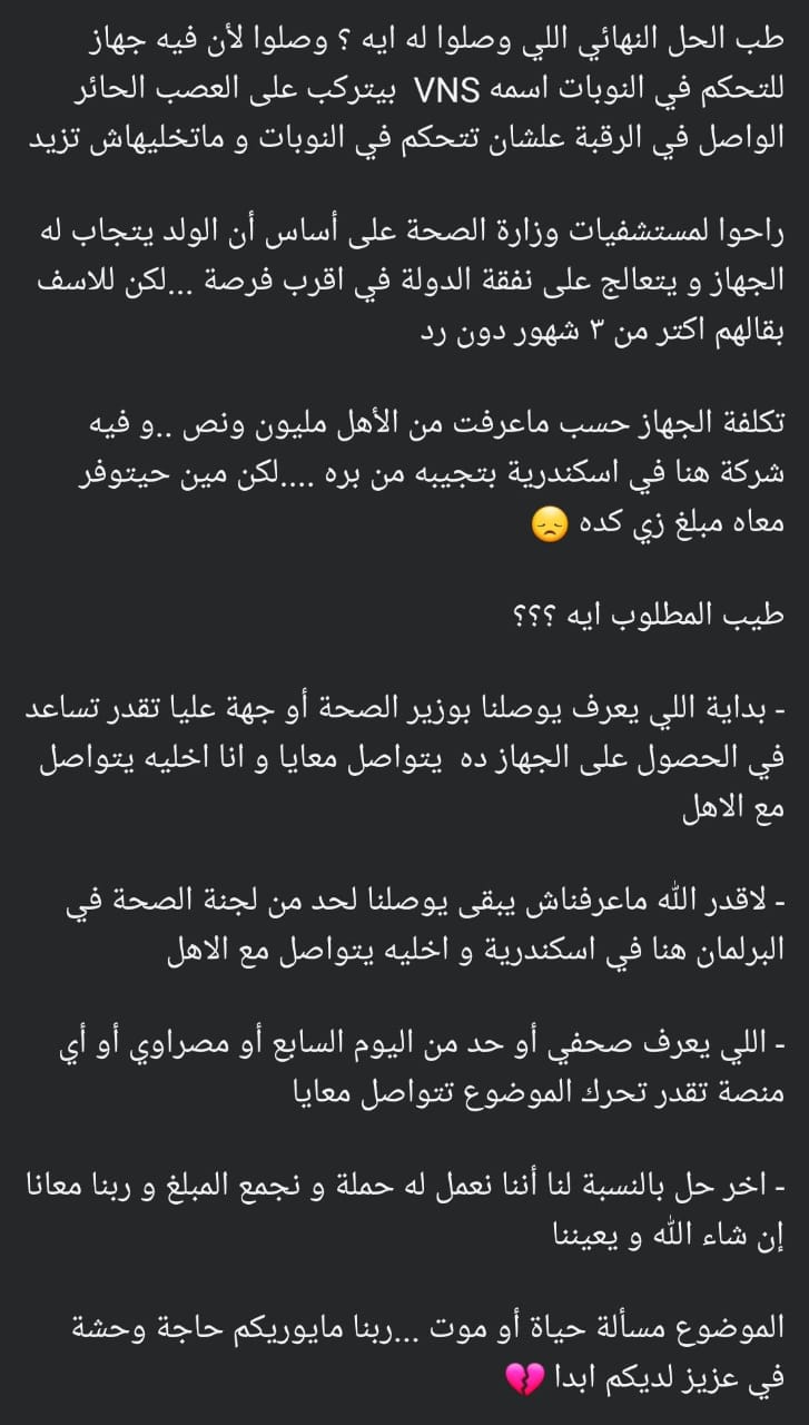 واستأنفت: "راحوا لمستشفيات وزارة الصحة على أساس أن الولد يتجاب له الجهاز، ويتعالج على نفقة الدولة في أقرب فرصة، لكن للأسف بقالهم أكتر من 3 شهور دون رد، تكلفة الجهاز حسب ما عرفت من الأهل مليون ونص.. وفيه شركة هنا في إسكندرية بتجيبه من بره، لكن مين حيتوفر معاه مبلغ زي كده".