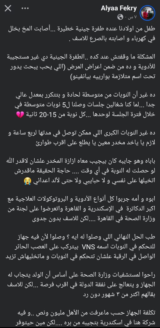 كتبت علياء فكري، المستشارة الفنية لمؤسسة تنمية مهارات الطفل Eods، عن حالة الطفل “عمر”، الذي يعاني من أعراض متلازمة بوارييه بيانفينو قائلة: "طفل من أولادنا عنده طفرة جينية خطيرة.. أصابت المخ بخلل في الكهرباء و أصابته بالصرع للأسف".