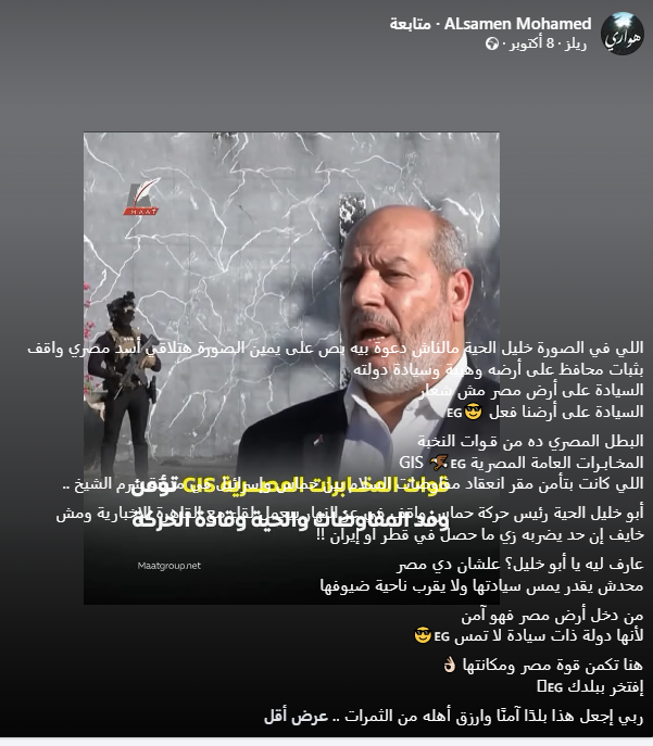 أحدث ظهور وفد حماس صدى واسعًا على منصات التواصل الاجتماعي، حيث علق أحد الجمهور على سيادة الأراضي المصرية، من خلال صورة الجندي المصري الذي ظهر في جميع لقاءات الحية في الإعلام، كتجسيد واضح للهيمنة المصرية على الأوضاع السياسية، وكتب: "في صورة خليل الحية هتلاقي بطل مصري أسد، واقف بثبات ومحافظ على أرضه وهويته وسيادة دولته، السيادة متمثلة على أرض مصر مش قطر".