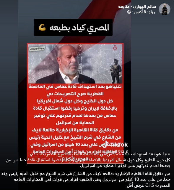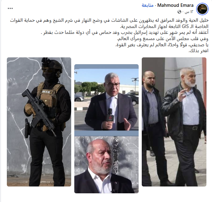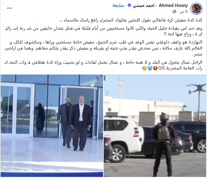 وأشار أيضًا إلى التأمين المكثف لوفد حماس، الذي افتقده أثناء وجوده في الأراضي القطرية والإيرانية، ما أدى لاستهداف القيادات بسهولة في عقر دارهم، قائلاً: "أبو خليل واقف بيعمل لقاء مع القاهرة الإخبارية، ومش خايف حد يضربه، علشان دي مصر ذات السيادة".