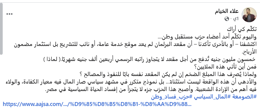 وقال رئيس حزب الدستور الأسبق علاء الخيام في منشور عبر صفحته بموقع “فيسبوك”: “تكلّم كي أراك، واليوم تكلّم أحد أعضاء حزب مستقبل وطن اكتشفنا – أو بالأحرى تأكدنا – أن مقعد البرلمان لم يعد موقع خدمة عامة، أو نائب للتشريع بل استثمار مضمون الأرباح”.