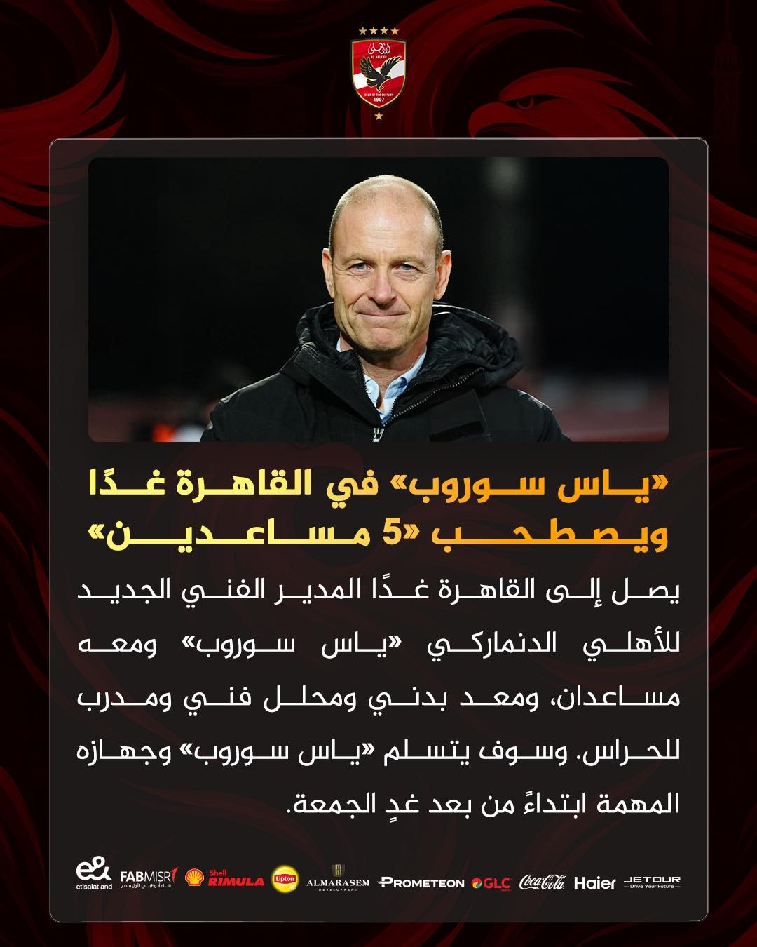يصل إلى القاهرة غدًا الخميس، المدير الفني الجديد للنادي الأهلي، الدنماركي يياس سوروب، برفقة طاقمه المعاون المكون من مساعدين اثنين، ومعد بدني، ومحلل فني، ومدرب حراس مرمى، على أن يبدأ مهامه رسميًا مع الفريق بعد غدٍ الجمعة.