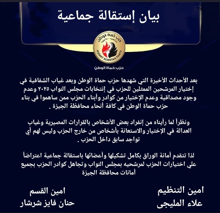 وقالت أمانة الوراق: "بعد الأحداث الأخيرة التي شهدها حزب حماة الوطن وبعد غياب الشفافية في اختيار المرشحين الممثلين للحزب في انتخابات مجلس النواب 2025 وعدم وجود مصداقية وعدم الاختيار من كوادر وأبناء الحزب ممن ساهموا في بناء حزب حماة الوطن في كافة أنحاء محافظة الجيزة ونظرًا لما رأيناه من انفراد بعض الأشخاص بالقرارات المصيرية وغياب العدالة في الاختيار والاستعانة بأشخاص من خارج الحزب وليس لهم أي تواجد سابق داخل الحزب، قررنا الاستقالة".