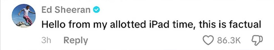 وفي تعليق طريف على منشور البرنامج عبر “إنستجرام” أكد إد شيران بنفسه القصة، وقال: “مرحبًا من وقتي المخصص لاستخدام الآيباد، كل ما قالته صحيح!”