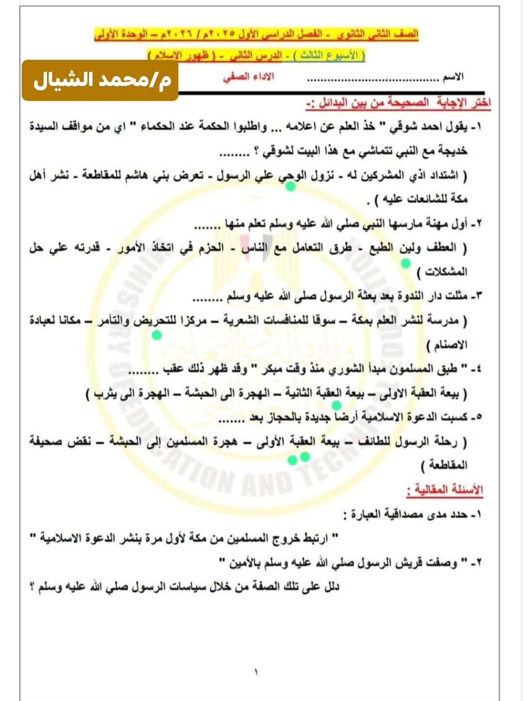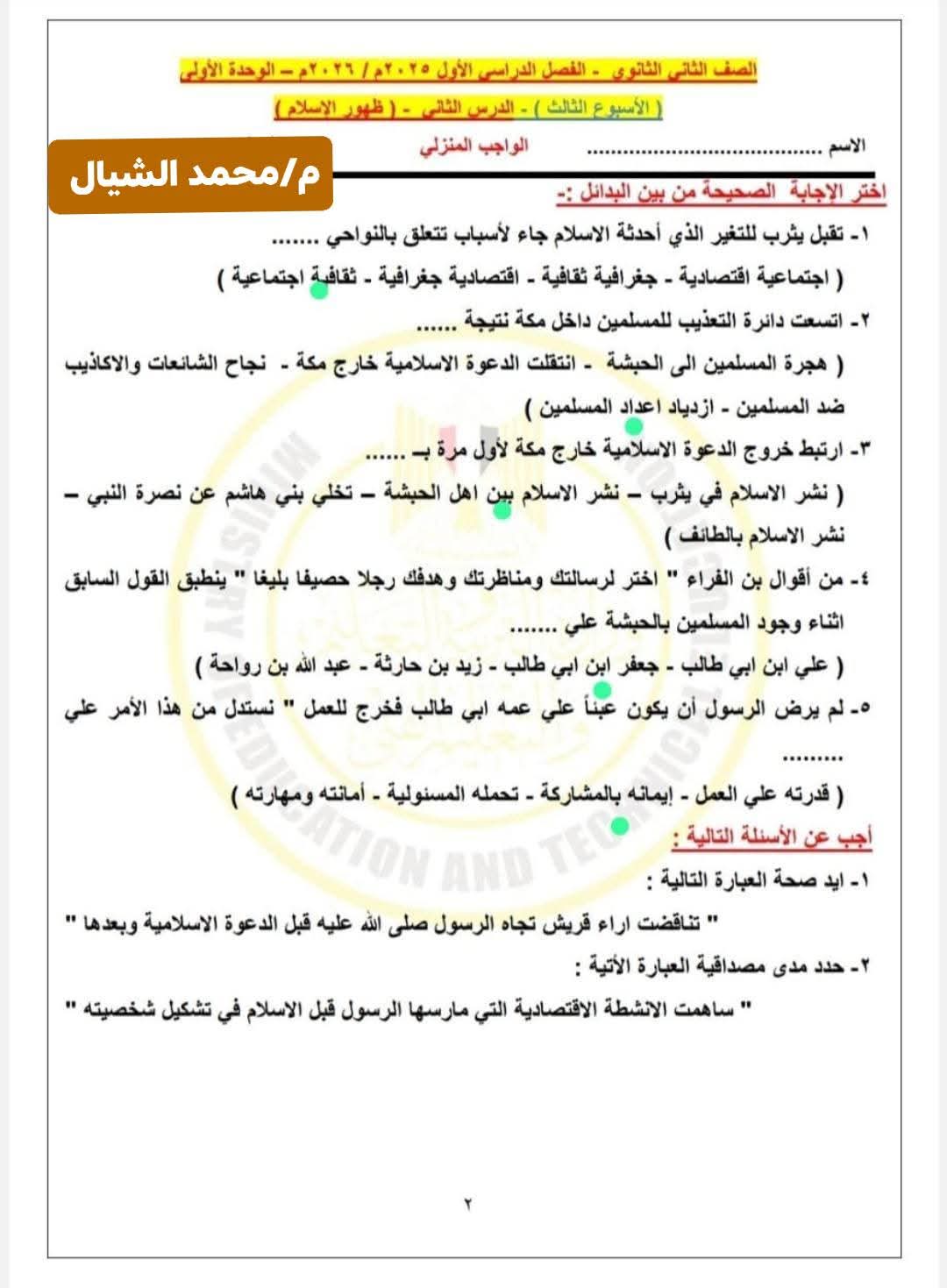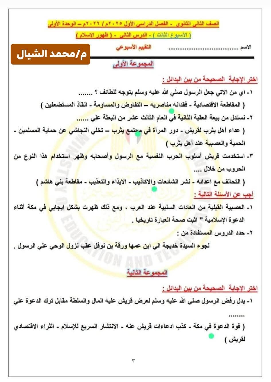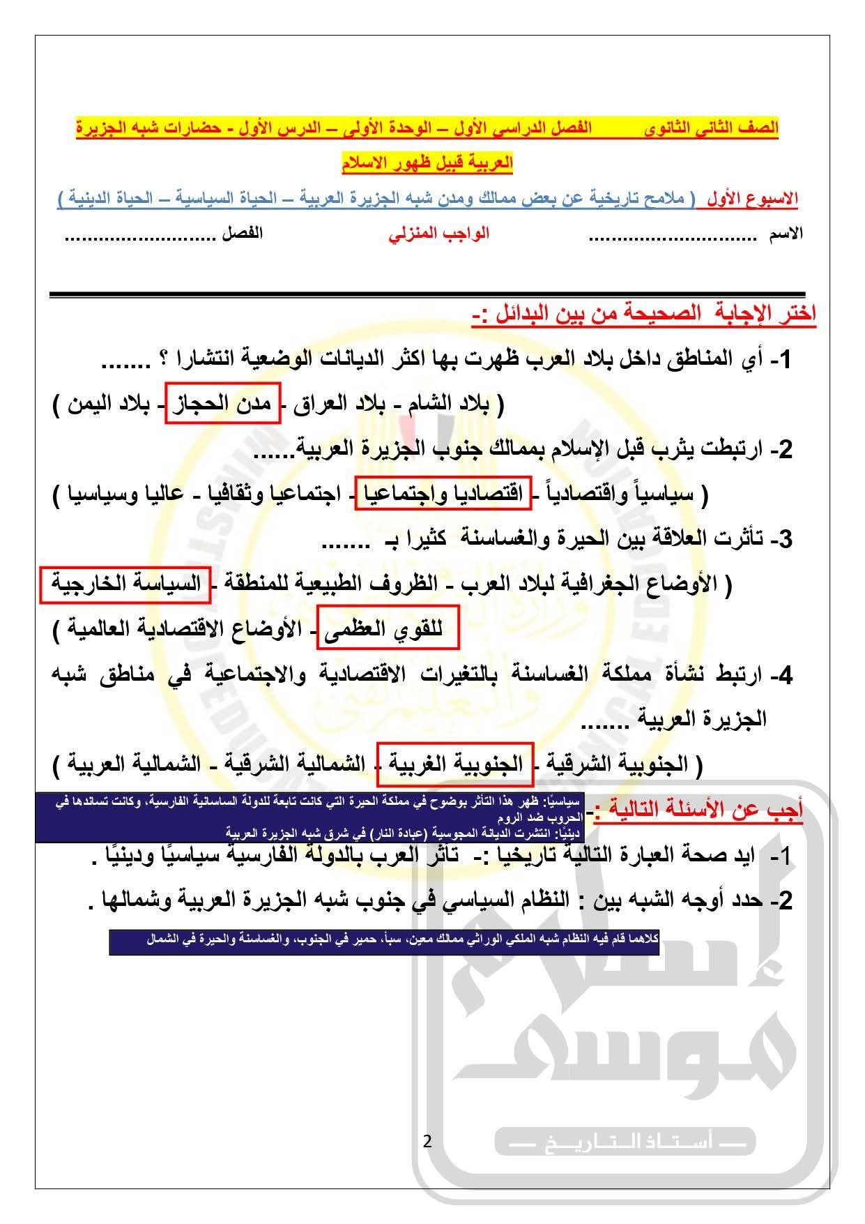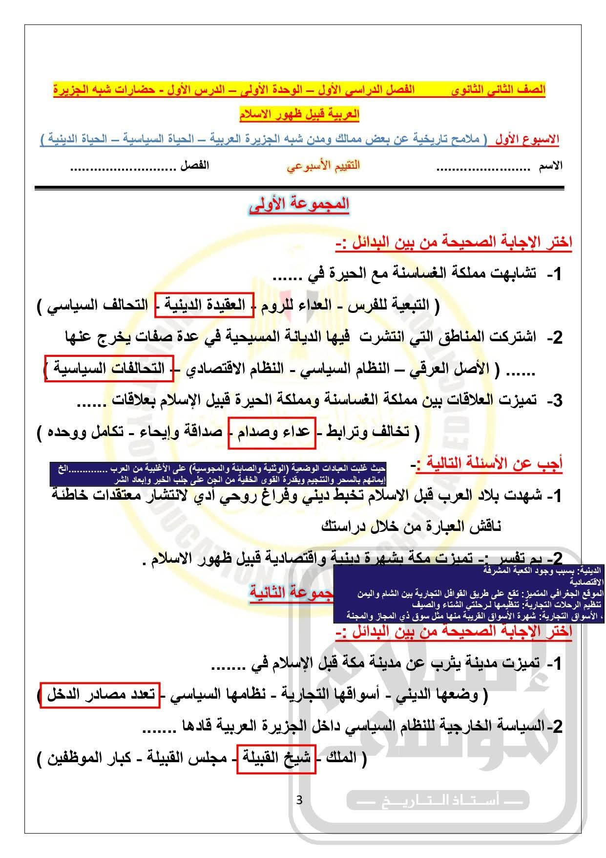 حل تقييم الأسبوع الثاني تاريخ تانية ثانوي