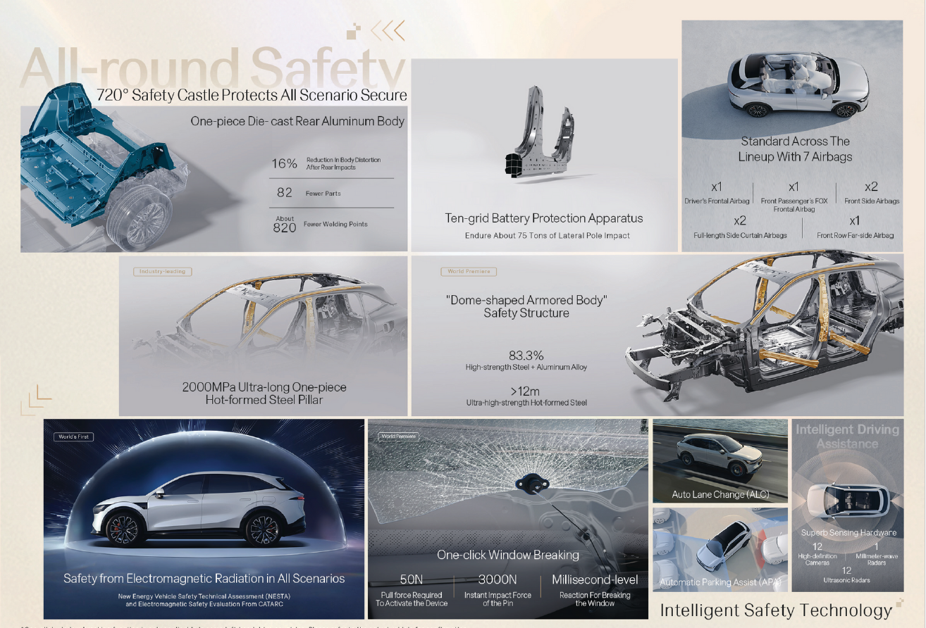 جهزت السيارة بمواصفات الأمان القياسية وأنظمة مساعدة السائق تشمل: عدد 7 وسائد هوائية، نظام فرامل ذكية مدمجة IPB، نظام استرداد قوة الفرامل، أنظمة مساعدة السائق أثناء القيادة ADAS تتضمن 15 خاصية، مثبت سرعة تكيفي ACC