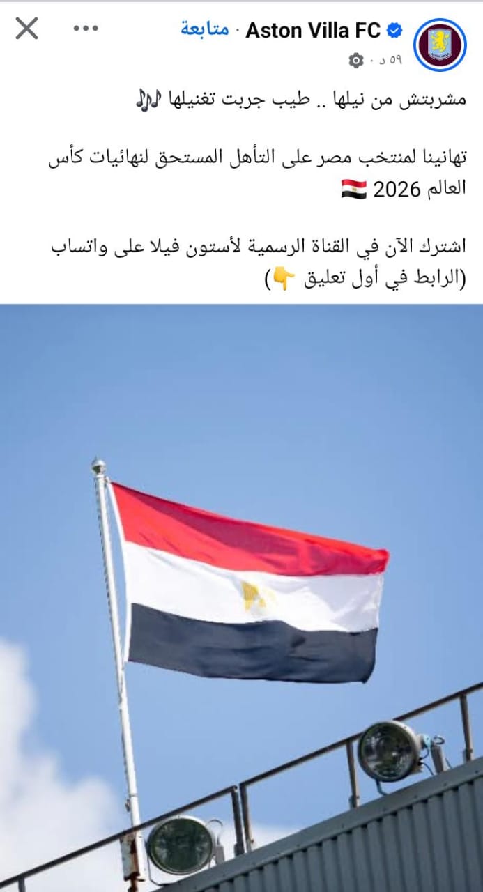 احتفل نادي أستون فيلا الإنجليزي، بصعود منتخب مصر إلى بطولة كأس العالم 2026، المُقرر إقامتها في الولايات المتحدة الأمريكية، كندا، والمكسيك.