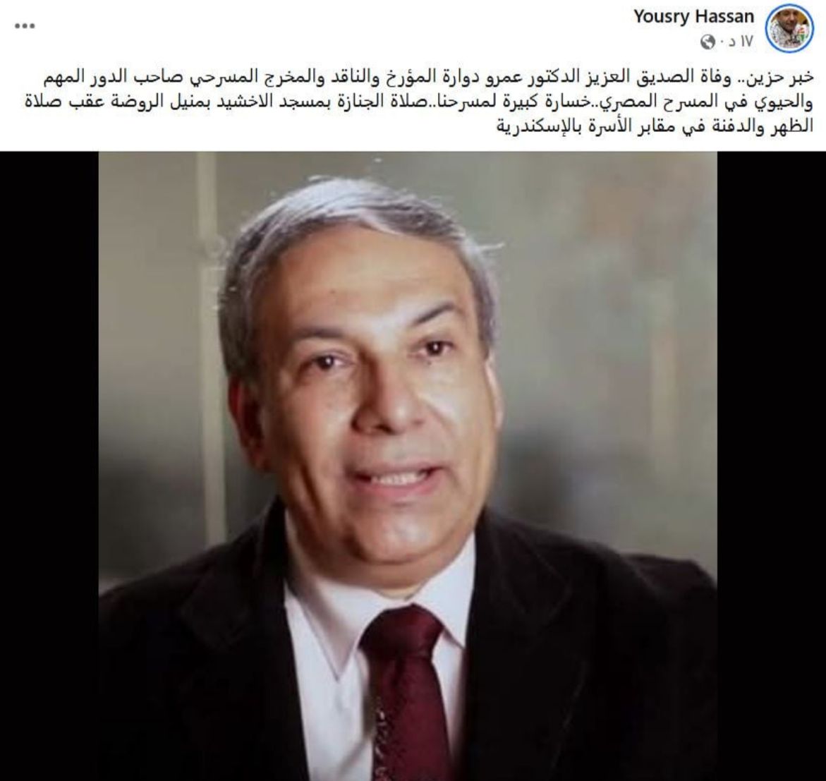 وأعلن يسري حسان الكاتب والناقد المسرحي عبر صفحته على فيسبوك، خبر وفاة الدكتور عمرو دوارة، معبرًا عن حزنه لخسارة المسرح المصري لهذه الشخصية المهمة.