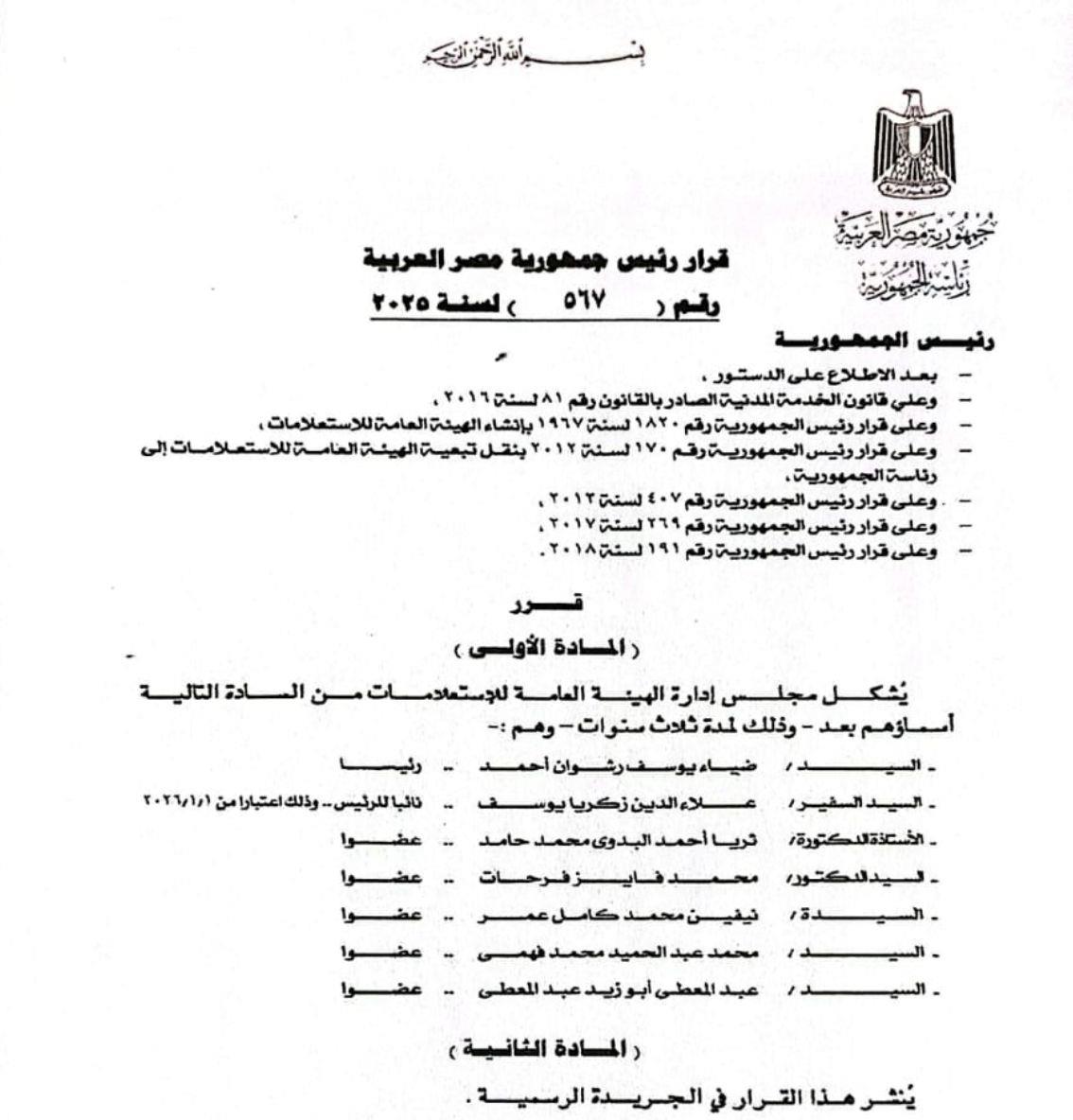 أصدر الرئيس عبدالفتاح السيسي، قرارا بإعادة تشكيل مجلس إدارة الهيئة العامة للاستعلامات، على أن يتولى ضياء رشوان رئاسة المجلس.