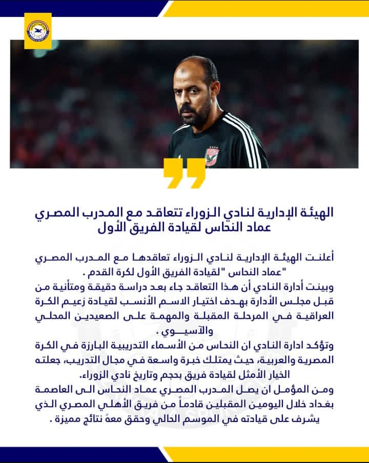 أعلنت الهيئة الإدارية لنادي الزوراء العراقي رسميًا تعاقدها مع المدرب عماد النحاس لتولي القيادة الفنية للفريق الأول لكرة القدم، في خطوة تهدف إلى تعزيز مسيرة الفريق على المستويين المحلي والآسيوي.