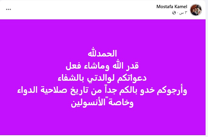 وكشف مصطفى كامل تفاصيل الواقعة عبر منشور على حسابه الرسمي بموقع فيسبوك، قال فيه: "قدر الله وما شاء فعل.. دعواتكم لوالدتي بالشفاء، وأرجوكم خدوا بالكم من تاريخ صلاحية الدواء وخاصةً الإنسولين".