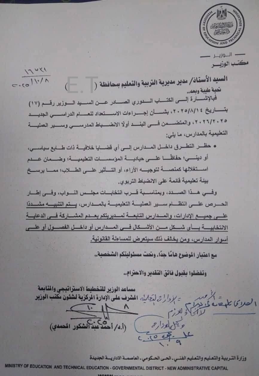 أكدت وزارة التعليم، في خطاب رسمي مرسل للمديريات التعليمية، بمناسبة قرب انتخابات مجلس النواب، أنه من سيخالف ذلك سيتعرض للمساءلة القانونية.