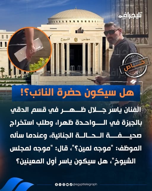 ورصدت كاميرا "تليجراف مصر"، وصول ياسر جلال برفقة أحد أصدقائه وسائقه إلى مقر قسم شرطة الدقي، حيث توجه لاستخراج صحيفة الحالة الجنائية "فيش وتشبيه".