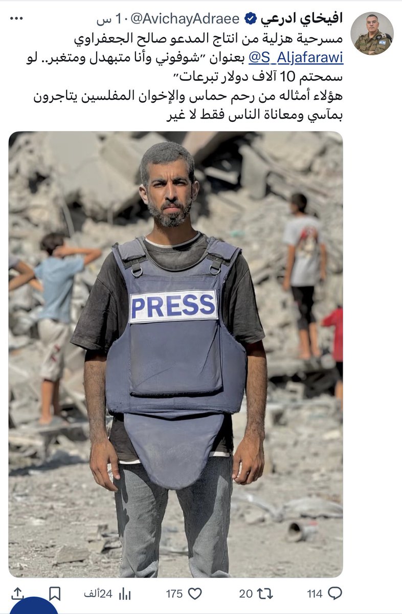 وكان أفيخاي أدرعي المتحدث باسم قوات الدفاع الاسرائيلية، كتب منشورًا الشهر الماضي على منصة إكس، يهاجم فيه الجعفراوي، ويتهمه باستغلال مآسي الفلسطينيين حيث قال: "مسرحية هزلية من إنتاج المدعو صالح الجعفراوي، بعنوان “شوفوني وأنا متبهدل ومتغبر.. لو سمحتم 10 آلاف تبرعات، هؤلاء أمثاله من رحم حماس والإخوان المفلسين يتاجرون بمآسي ومعاناة الناس فقط لا غير”.