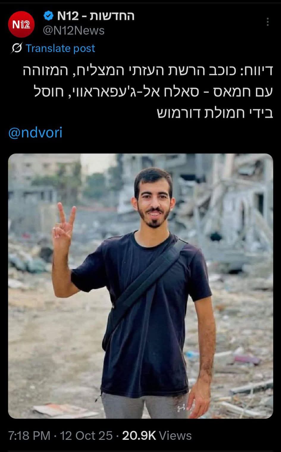 وأعلنت إسرائيل مقتـل صالح الجعفراوي، عبر الصفحة الرسمية للقناة 12 العبرية بمنصة إكس، وكتبت:"نجم الإنترنت الغزّي الناجح التابع لحماس صالح الجعفراوي قُتل على يد عائلة درموش".