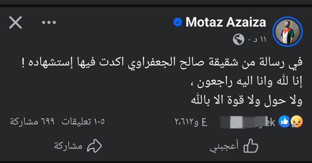 ووفقًا لمصادر فلسطينية تم تأكيد استشهاد الصحفي والمؤثر صالح الجعفراوي، بعد اختفائه المفاجئ الذي أثار قلق رواد مواقع التواصل.